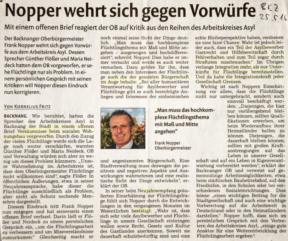 1. Anmietung privater Wohnungen durch die Stadt 2. Gemeinderatsbeschluss zur Quotierung bei Neu-Bebauung 3. Eigeninitiative der Stadt zum Neubau. Als Vorbild dafür wird auf eine Initiative der Stadt Schwäbisch Gmünd verwiesen. In der Backnanger Kreiszeitung vom 23. Mai 2016 wird unter der Überschrift ”Arbeitskreis Asyl sieht den sozialen Frieden in Gefahr” die Initiative des AK aufgegriffen, und es werden die Stellungnahmen der adressierten Politiker veröffentlicht. Die beiden ersten Vorschläge des AK werden von den befragten Politikern im Großen und Ganzen abgelehnt. Initiativen zum Bau von Sozialwohnungen werden heruntergespielt (”auf Sicht fahren”, OB Nopper) oder es wird auf einen angedachten (OB Nopper) oder geplanten Anteil von geförderten Wohnungen in Neubaugebieten verwiesen (SPD-Fraktionsvorsitzender Heinz Franke). In dem BKZ-Artikel wird vonseiten des AK auch deutliche Kritik an der Einstellung des OB gegenüber Flüchtlingen geäußert. Dieser weist in einem offenen Brief diese Vorwürfe zurück. BKZ vom 25.5.2016: ”Nopper wehrt sich gegen Vorwürfe” Aktueller Stand zu den Planungen (Herbst 2016):