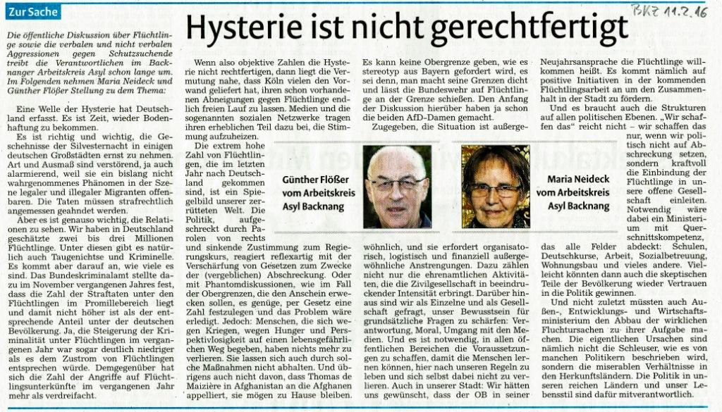 Unter der Überschrift ”Hysterie ist nicht gerechtfertigt” nahmen die Verantwortlichen im AK, Maria Neideck und Günther Flößer, in der Backnanger Kreiszeitung vom 11. Februar 2016 dazu Stellung. Fußball-Aktivitäten: