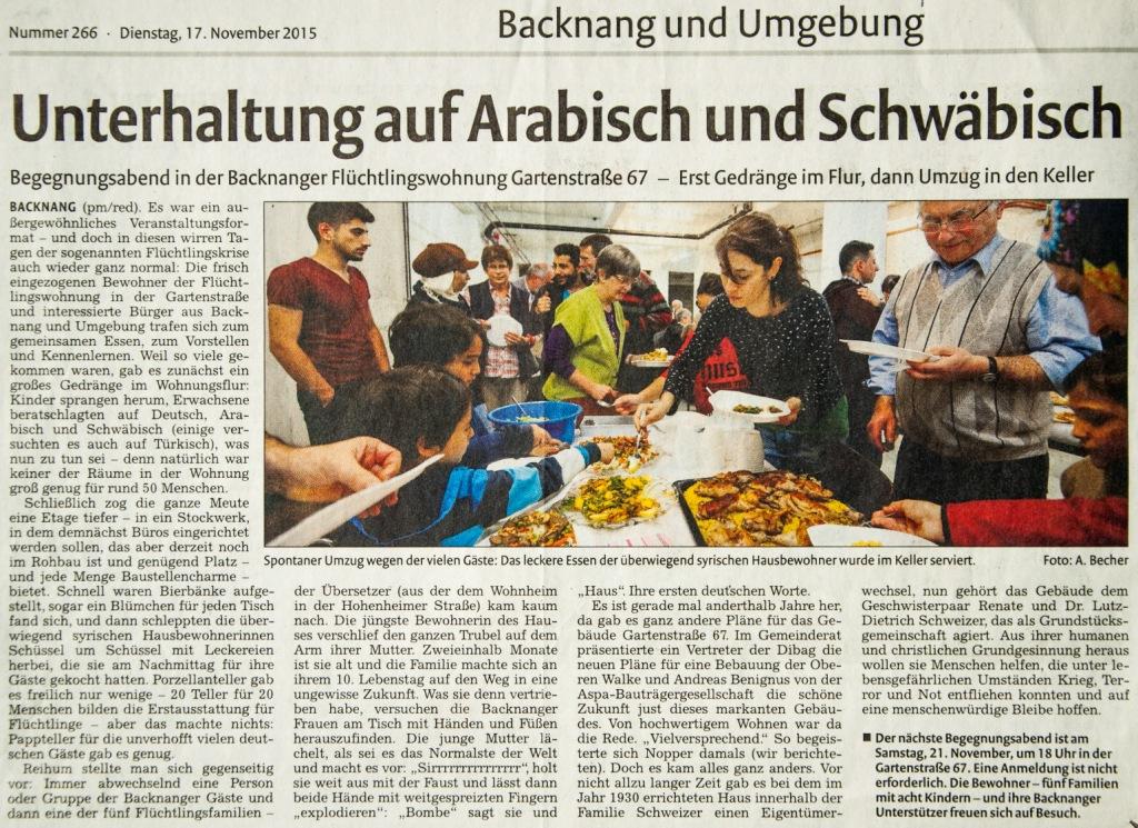 Die Backnanger Kreiszeitung berichtet darüber am 09.10.2015: "Kirchenasyl schneller beendet als gedacht" August/November 2015: Weitere Backnanger Flüchtlingsunterkunft: kontroverse Diskussion im Gemeinderat und BegegnungsabendNeben der großen Gemeinschaftsunterkunft für etwa 220 Flüchtlinge in der Hohenheimer Straße und der provisorischen Unterbringung von etwa 100 Flüchtlingen in der Sporthalle des Berufsschulzentrums (zum zweiten Mal in diesem Jahr!) soll in zentraler Lage in Backnang eine weitere reguläre Unterkunft für 25 Flüchtlinge eröffnet werden. Die Initiative dazu geht vom Backnanger Arzt und Gemeinderats-Fraktionsvorsitzenden der Christlichen Initiative Backnang, Dr. Lutz-Dietrich Schweizer und seiner Schwester Renate Schweizer aus, die einen Teil ihrer Immobilie an das Landratsamt vermieten.