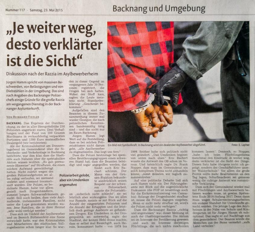StZ vom 20.05.2015: "Razzia mit 250 Polizisten im Flüchtlingsheim" StN vom 20.05.2015: "Fahndungserfolg? 100 Gramm Cannabis gefunden"