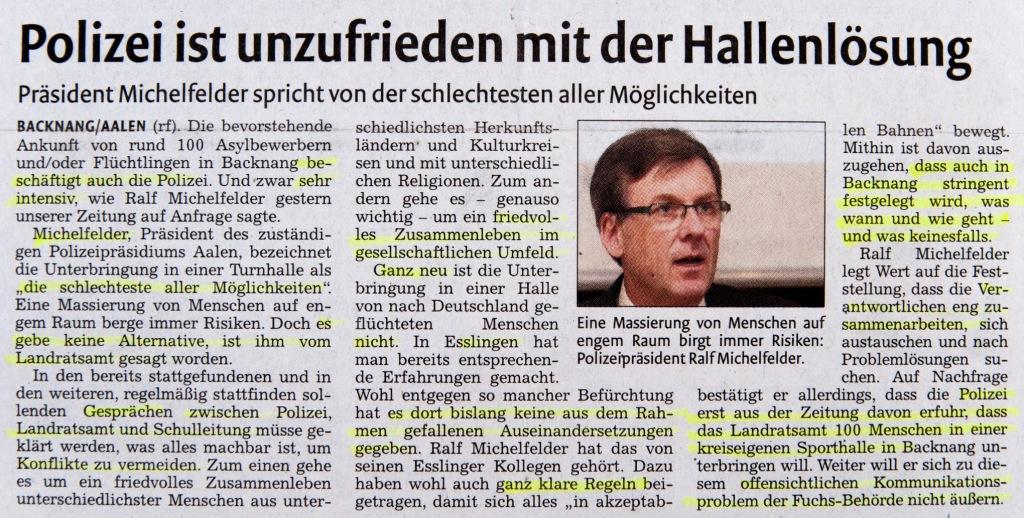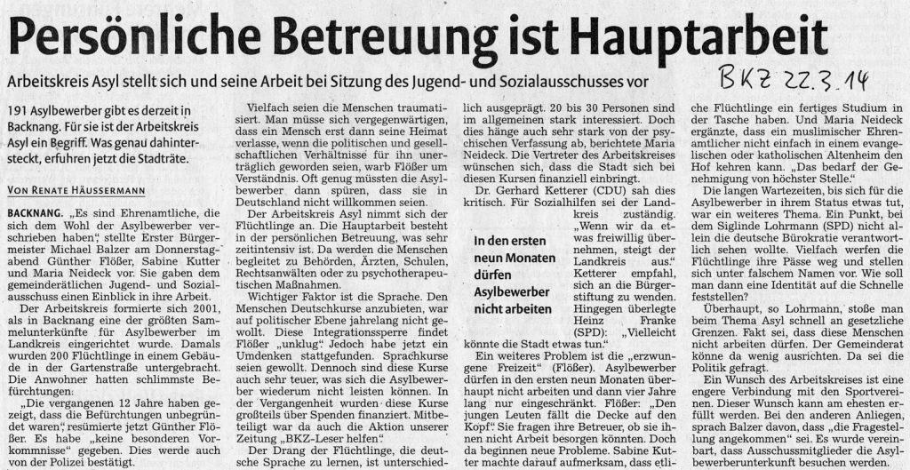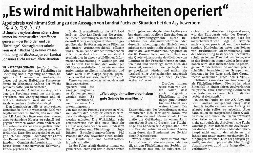 Im Mantelteil der Backnanger Kreiszeitung (Stuttgarter Nachrichten) erscheint am 24.1.2014 ein Artikel mit der tendenziösen Überschrift „Zahl der straffälligen Asylbewerber steigt deutlich“. Im Artikel wird zwar (mit nicht nachvollziehbaren Zahlen) darauf hingewiesen, dass mit der steigenden Asylbewerberzahl auch die Zahl der tatverdächtigen Personen gestiegen sei, der AK Asyl Backnang wertet die Überschrift aber in einem Leserbrief als Stimmungsmache.