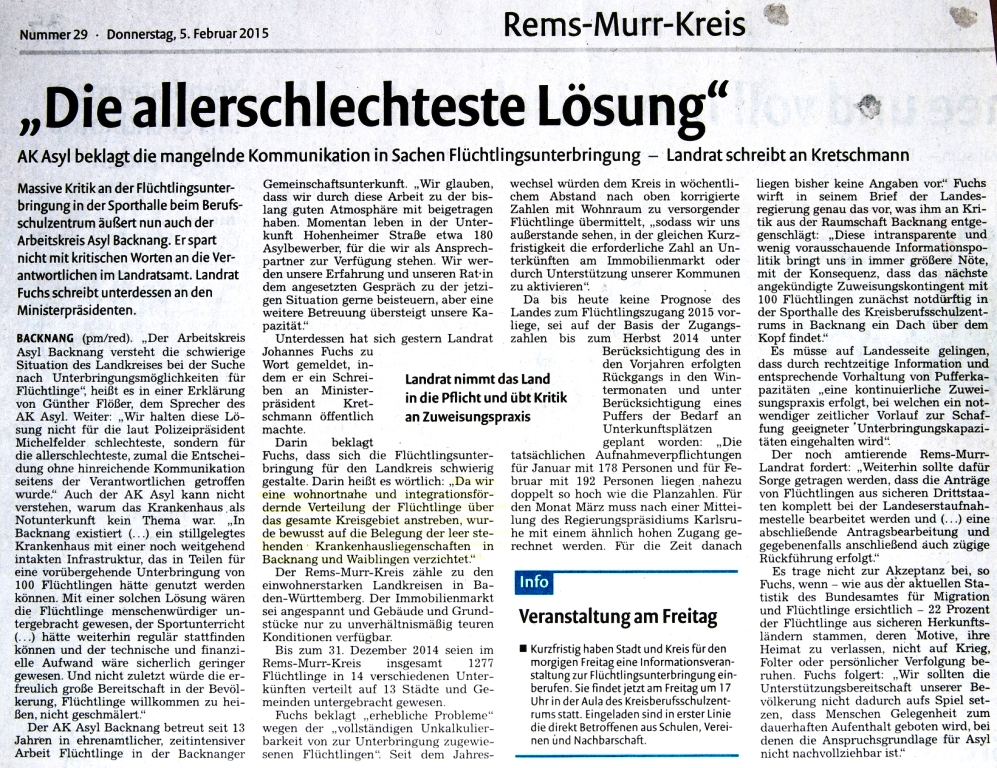Januar/Februar 2015: Turnhallenbelegung mit Flüchtlingen in Backnang Wie andere Landkreise hat auch der Rems-Murr-Kreis Probleme mit der Unterbringung von Flüchtlingen. Als letzte Notlösung, sonst eigentlich nur Naturkatastrophen vorbehalten, verfällt man auf die vorübergehende Nutzung der Sporthalle im Berufsschulzentrum Backnang (Träger: der Landkreis). Die erste öffentliche Ankündigung erfolgt am 29. Januar im Sportteil der Backnanger Kreiszeitung: "Sporthalle wird Flüchtlingsunterkunft"
