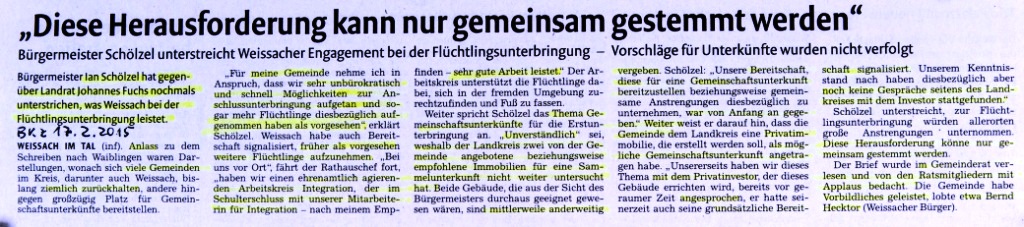 12 Tage später ziehen fast 100 Flüchtlinge in der Turnhalle ein. Wie zu erwarten, setzt eine lebhafte öffentliche Diskussion ein: von offizieller Seite wird diese Lösung als alternativlos erklärt, und es wird nach dem bekanntem Muster des Sankt-Florians-Prinzips auf die angeblich Schuldigen auf Landesebene verwiesen.Dazu noch werden die Flüchtlinge in gute und schlechte eingeteilt:: BKZ 30.01.2015: "Artikel: Wir sehen uns nunmehr gezwungen und Die Entwicklung erfüllt mich mit Sorge".