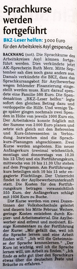 Wie bereits in früheren Jahren wurde der AK Asyl wieder von der Backnanger Kreiszeitung mit einer sehr großzügigen Spende bedacht: