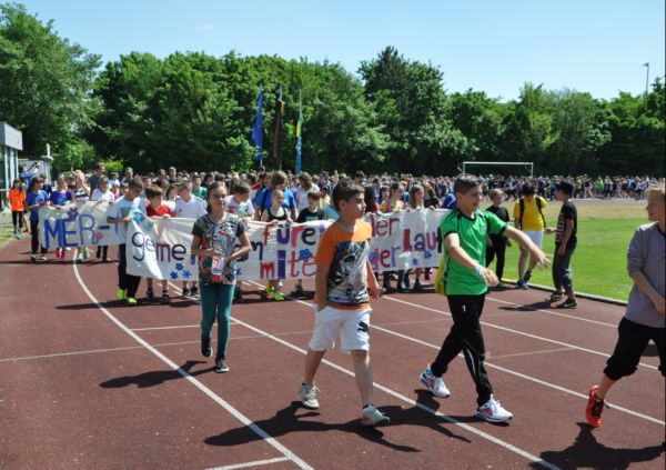 750 Schüler, 50 Lehrer und Flüchtlinge aus der Unterkunft in der direkten Nachbarschaft versammeln sich am 13. Mai, um mit möglichst vielen Runden ein hohes Spendenaufkommen zu erzielen. Der Erlös aus 14.000 Runden, nämlich unglaubliche 17.000 Euro, wird am letzten Schultag vor den Sommerferien dem AK symbolisch übergeben. Das Geld kann der AK in Raten in Anspruch nehmen.