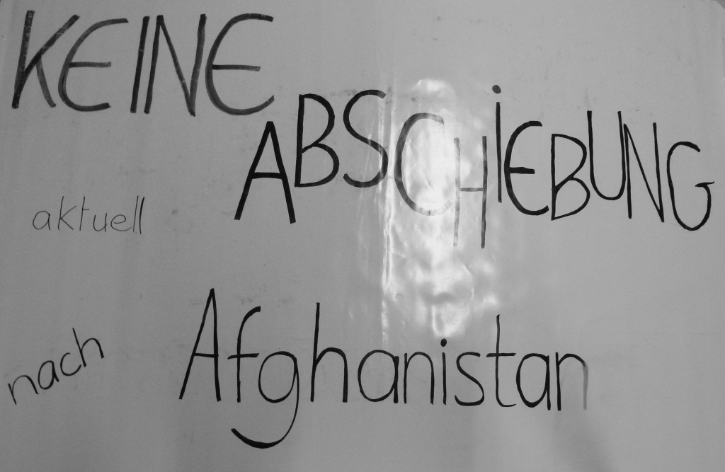 Abschiebungspraxis zu demonstrieren. Ein markantes Transparent lautet: „Gestern